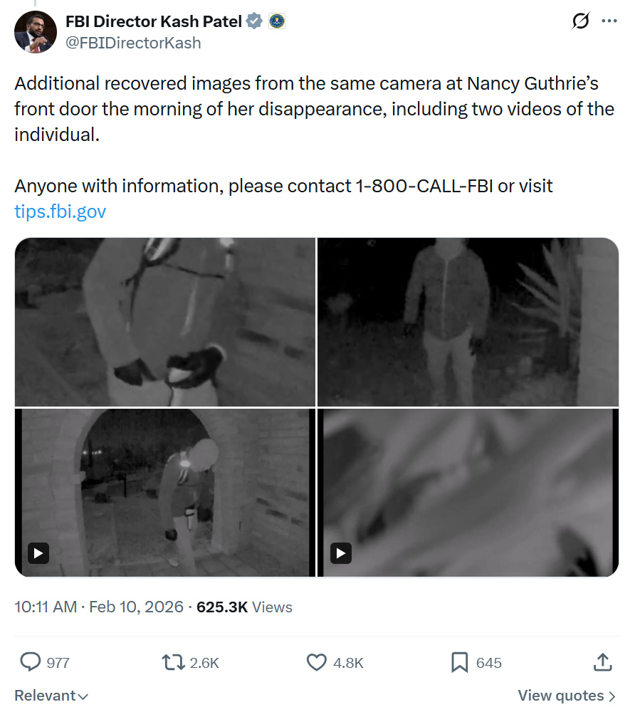 Over the last eight days, the FBI and Pima County Sheriff’s Department have been working closely with our private sector partners to continue to recover any images or video footage from Nancy Guthrie’s home that may have been lost,… pic.twitter.com/z5WLgPtZpT— FBI Director Kash Patel (@FBIDirectorKash) February 10, 2026